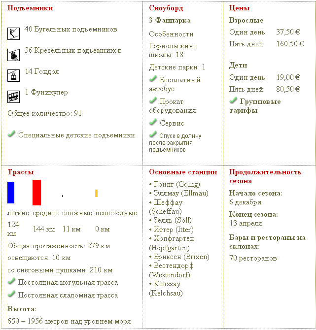 Профессионалам и полупрофессионалам здесь будет вполне интересно, вас порадуют 27 черных трасс и 280 спусков. Посоветуем черный спуск с Хоэ Салве (Hohe Salve), и красные трассы в Вестердорфе (Westerdorf). Плюсы: много скоростных спусков, спусков с трамплинами, трасс для фрирайда, трассы для слаломного спуска, современные и быстрые подъемники. Для профи с соответсвующими навыками можно посоветовать неподготовленный спуск с Шеффау. Длина его около 100 метров, и при нормальном количестве снега вам он очень запомнится.