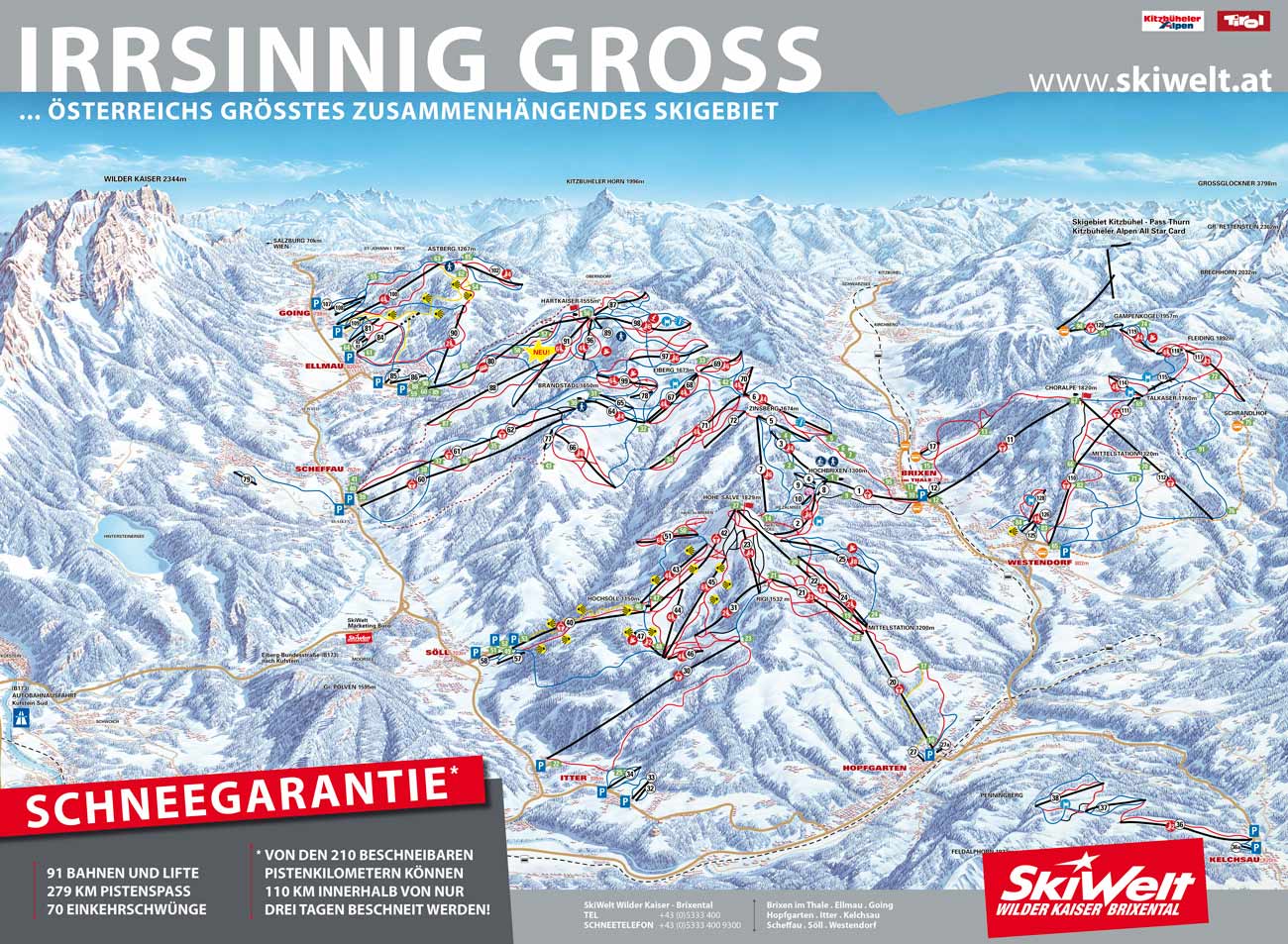 Вильден Кайзер - Бриксенталь Wilder Kaiser - Brixental является самым большим горнолыжным комплексом в Австрии. Добраться сюда можно: с севера (из Германии) по А93 через Киферсфельден (Kiefersfelden) и далее по А12 до Куфштайна (Kufstein). Затем сворачиваем на В173 и едем прямо до Зёлль, Шеффау, Эллмау или Гоинга. Если же вы едете из Иннсбрука, то сворачивайте с автобана по указателю на Worgl Ost, а затем поезжайте по трассе 170 по направлению на Иттер, Хопфгартен, Вестендрф или Бриксен.